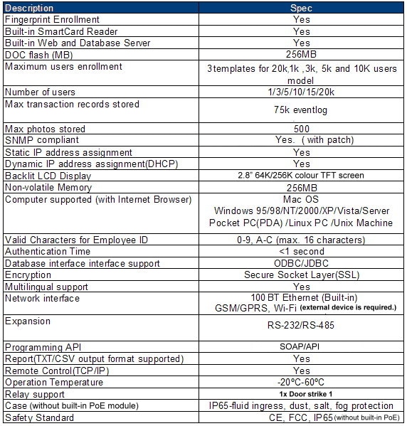 | Modes of Authentication | Fingerprint, Facial, Smartcard, PINID + Fingerprint, Facial + Fingerprint Smartcard + Fingerprint, Smartcard + FacialSmartcard + PIN | ||||||||||||