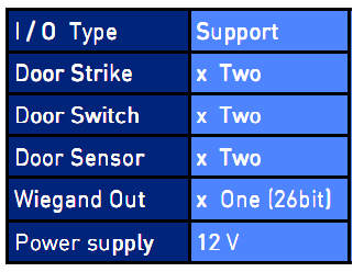 | I/O Interface | – RS-232/RS-485 – Wiegand output (26bit) – Power to strike, 12V DC at Max 500mA | ||||||||||||