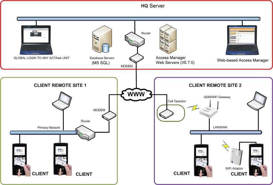 The diagram above shows a complete Access Control solution that uses network/internet connectivity to deliver remote site control, monitoring and reporting. The embedded web-server feature in the ACTAtek unit allows simple browser access to any ACTAtek unit, anywhere in the world. User registration and access rights can be set via the browser or via the client/server application, ACTAtek Access Manager.