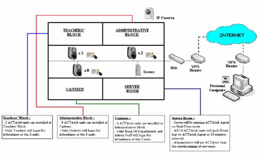 All students and staff would log IN/OUT their attendance using a combination of their Smart Card and fingerprint authentication. For enrolment of new users, the administrator uses PC based ACTAtek LogiPrint and ACTAtek Sync to synchronize new users to respective ACTAtek units. (Note:ACTAtek had released the new FingerPrint plus Smart Card Hybri-Model which can read new Singapore CEPAS card together with FingerPrint Authentication.)